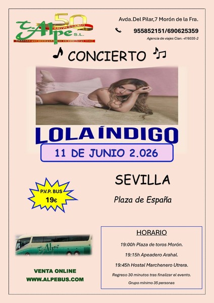 Alpe te lleva al Concierto de Lola Índigo en Sevilla. Incluye autobús y seguro de viajeros. Regreso 30 minutos después de la finalización.