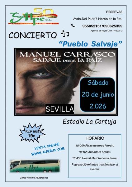 Alpe te lleva al Concierto de Manuel Carrasco en Sevilla. PUEBLO SALVAJE. Incluye autobús y seguro de viajeros. Regreso 30 minutos después de la finalización.