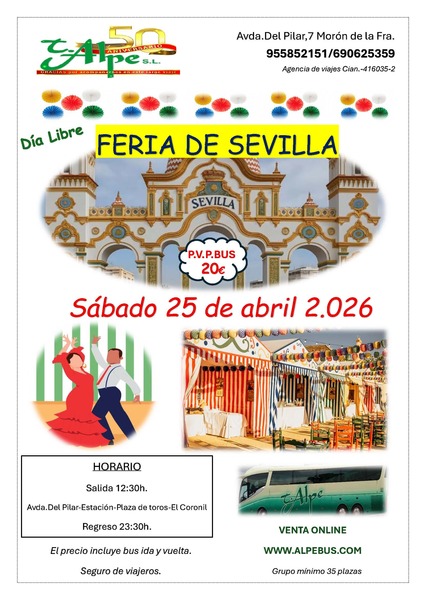 Alpe te lleva a la Feria de abril de Sevilla. Incluye autobús y seguro de viajeros. Regreso a las 23:30 horas.