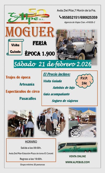 Alpe te lleva a la Feria de Época 1900 de Moguer. Incluye visita guiada, autobús y seguro de viajeros. Regreso a las 19:00 horas.