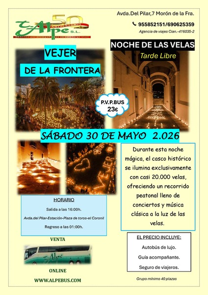 Alpe te lleva a la Noche de las Velas de Vejer de la Frontera. Incluye autobús y seguro de viajeros. Regreso a la 1 de la madrugada.