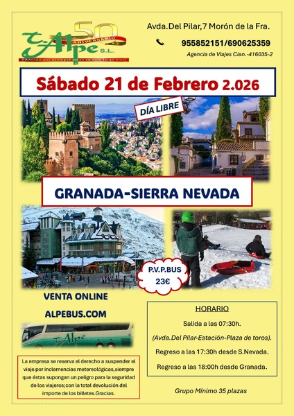 Alpe te lleva de día libre a Granada o a Sierra Nevada. Incluye autobús y seguro de viajeros. Regreso a las 17:30 horas desde Sierra Nevada o a las 18:00 horas desde Granada.