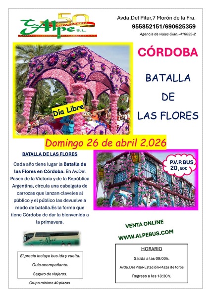 Alpe te lleva a la Batalla de las Flores de Córdoba. Incluye autobús, seguro de viajeros y guía acompañante. Regreso a las 18:30 horas.