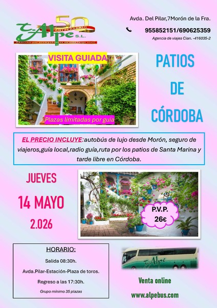 Alpe te lleva con visita guiada a los Patios de Córdoba. Incluye autobús, seguro de viajeros y guía local. Regreso a las 17:30 horas.